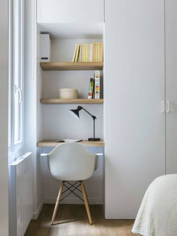 Photo : Décoration Romain Ricard/ Elle. Autre astuce : transformer une niche ou un espace mural inutilisé en bureau. Ici, une ancienne armoire murale laisse place à un plan de travail composé de simples étagères Ikea. Pratique, fonctionnel, discret. Cette configuration fonctionne particulièrement bien sur un pan de mur latéral.