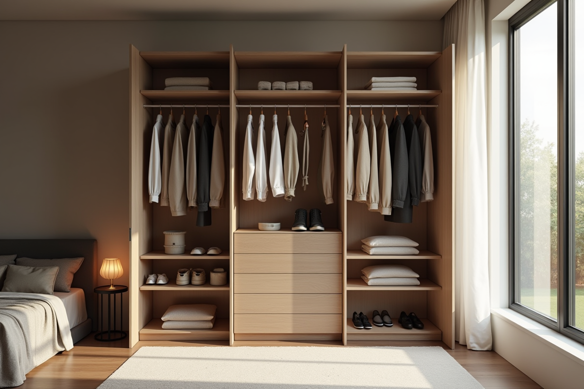 Armoire ouverte dans une chambre lumineuse avec vêtements minimalistes